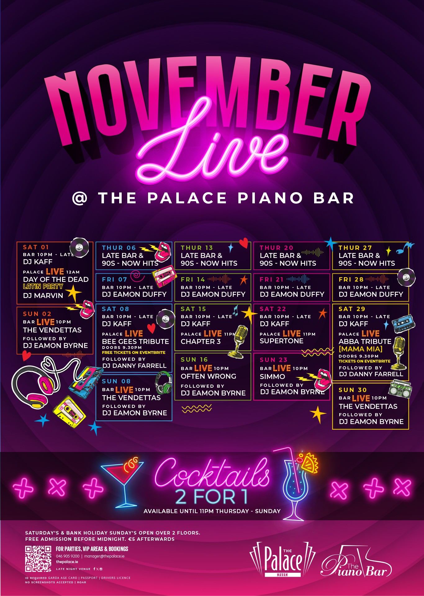 The Palace and Piano Bar Navan have facilities to cater for a wide variety of parties and events. We have areas available for private and semi-private events, including birthdays, hen parties, engagements, corporate functions and other celebrations.